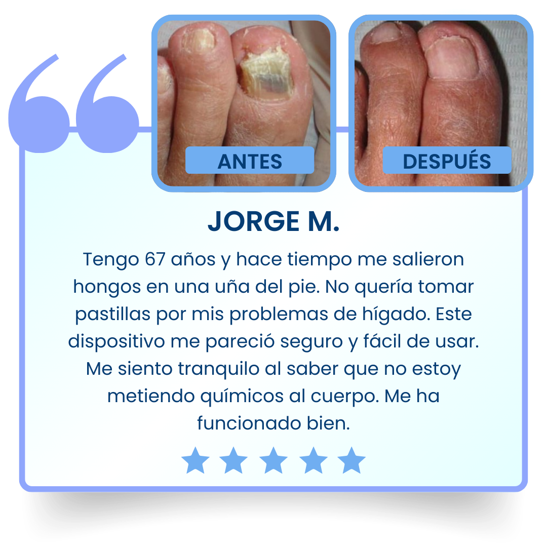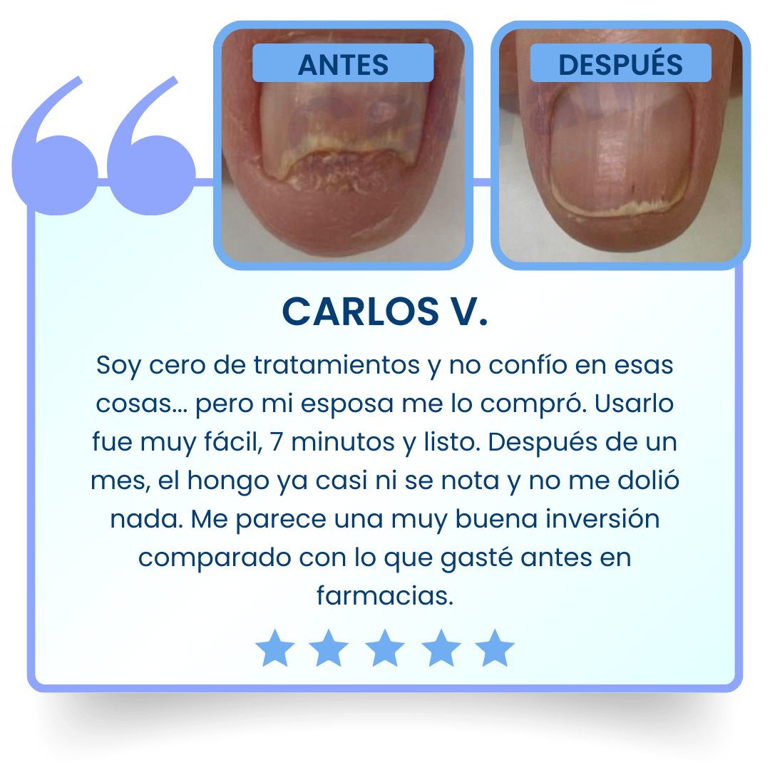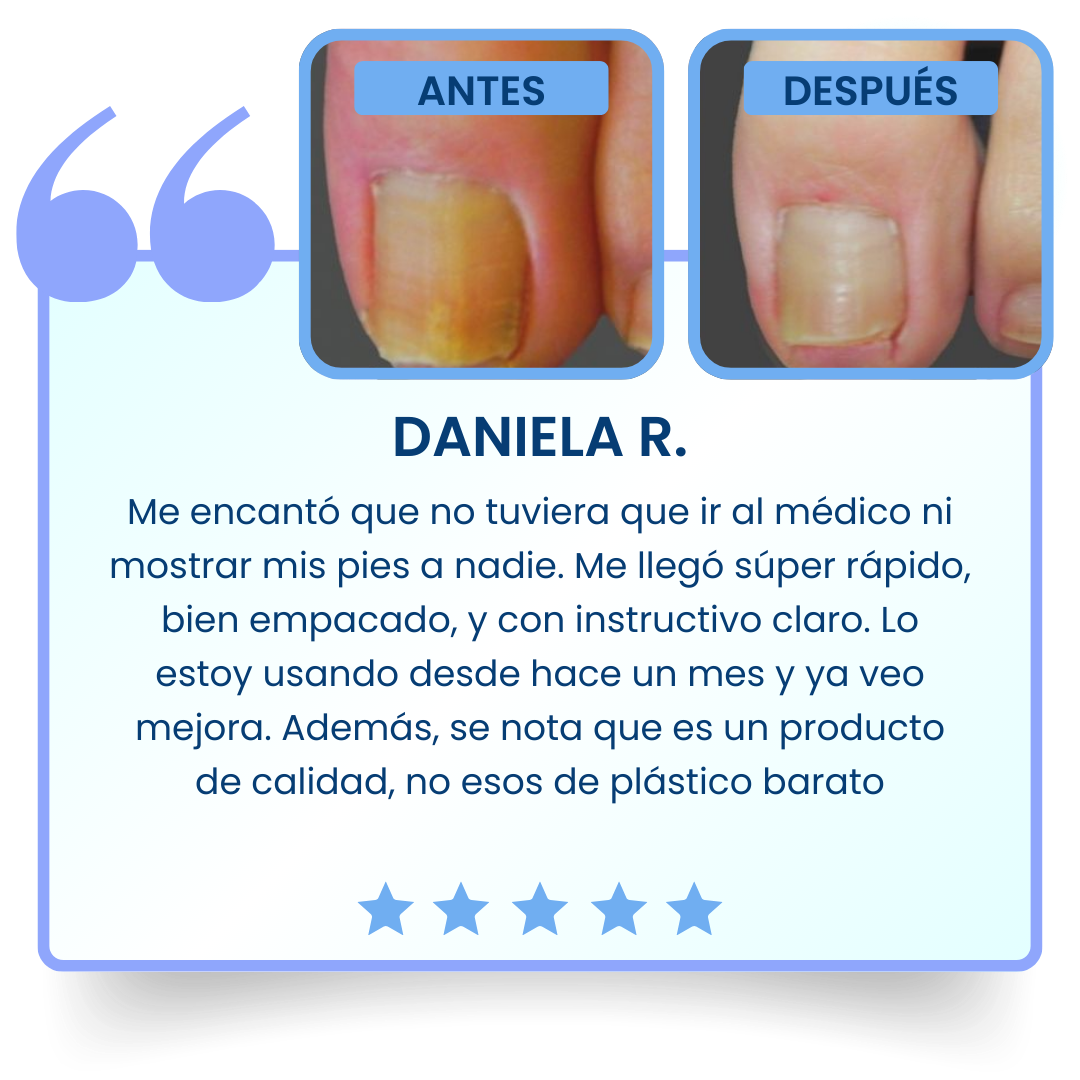Pedir una cita médica, mostrar tus pies frente a un desconocido, explicar el problema... es incómodo, muchas veces vergonzoso, y casi siempre termina en más gastos y más frustración.Los hongos en las uñas no solo afectan tu salud, también tu autoestima. Pero no deberías pasar por ese proceso para tratarlos.Hoy puedes hacerlo desde casa, en total privacidad, sin tener que exponerte ni perder tiempo entre trámites, salas de espera o tratamientos ineficaces.