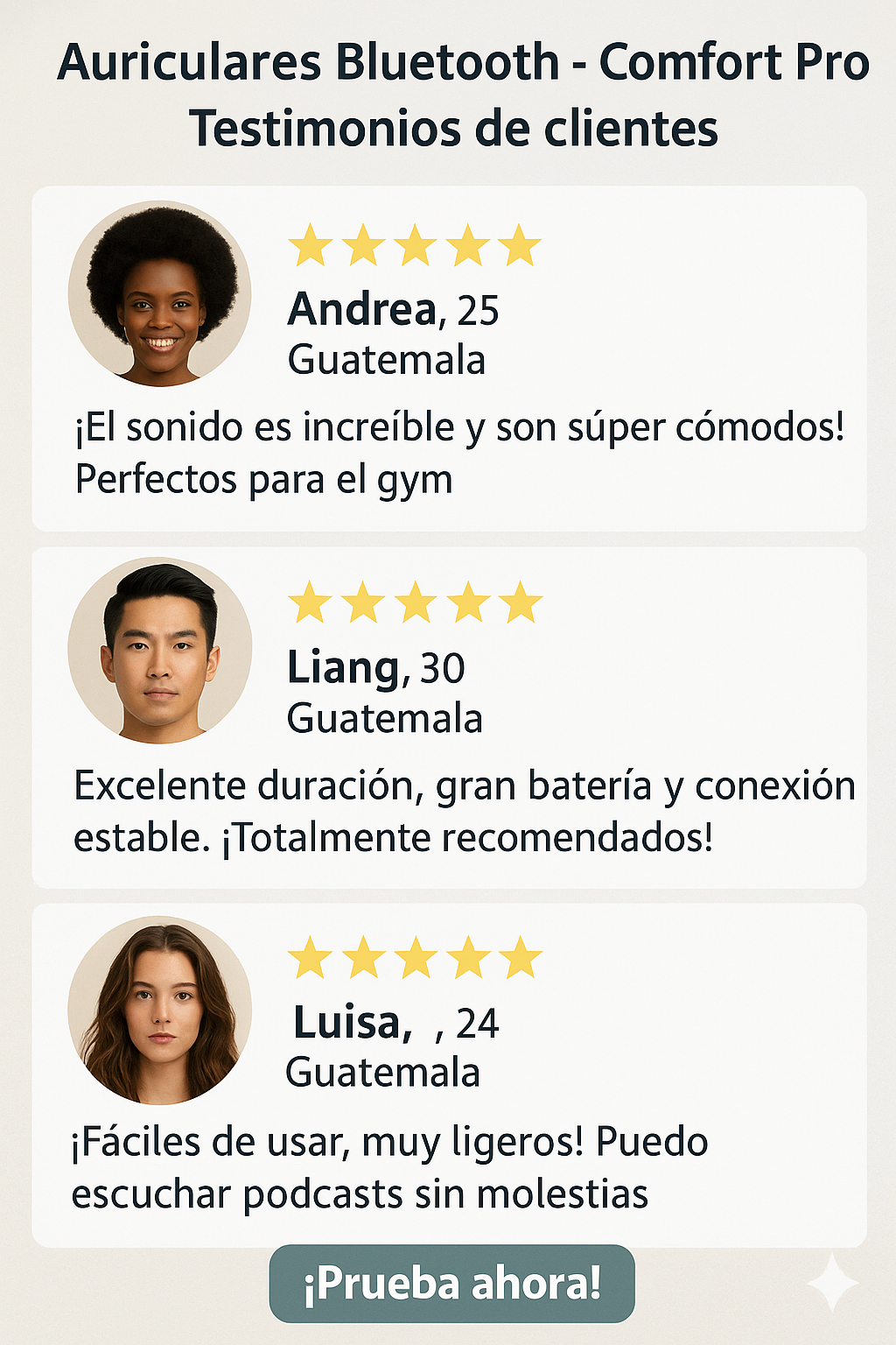 Los Auriculares Bluetooth Comfort Pro ofrecen una experiencia de sonido envolvente con conexión estable y batería de larga duración. Su diseño ergonómico garantiza comodidad durante todo el día, mientras que su resistencia al sudor los hace perfectos para entrenar o usar en movimiento.